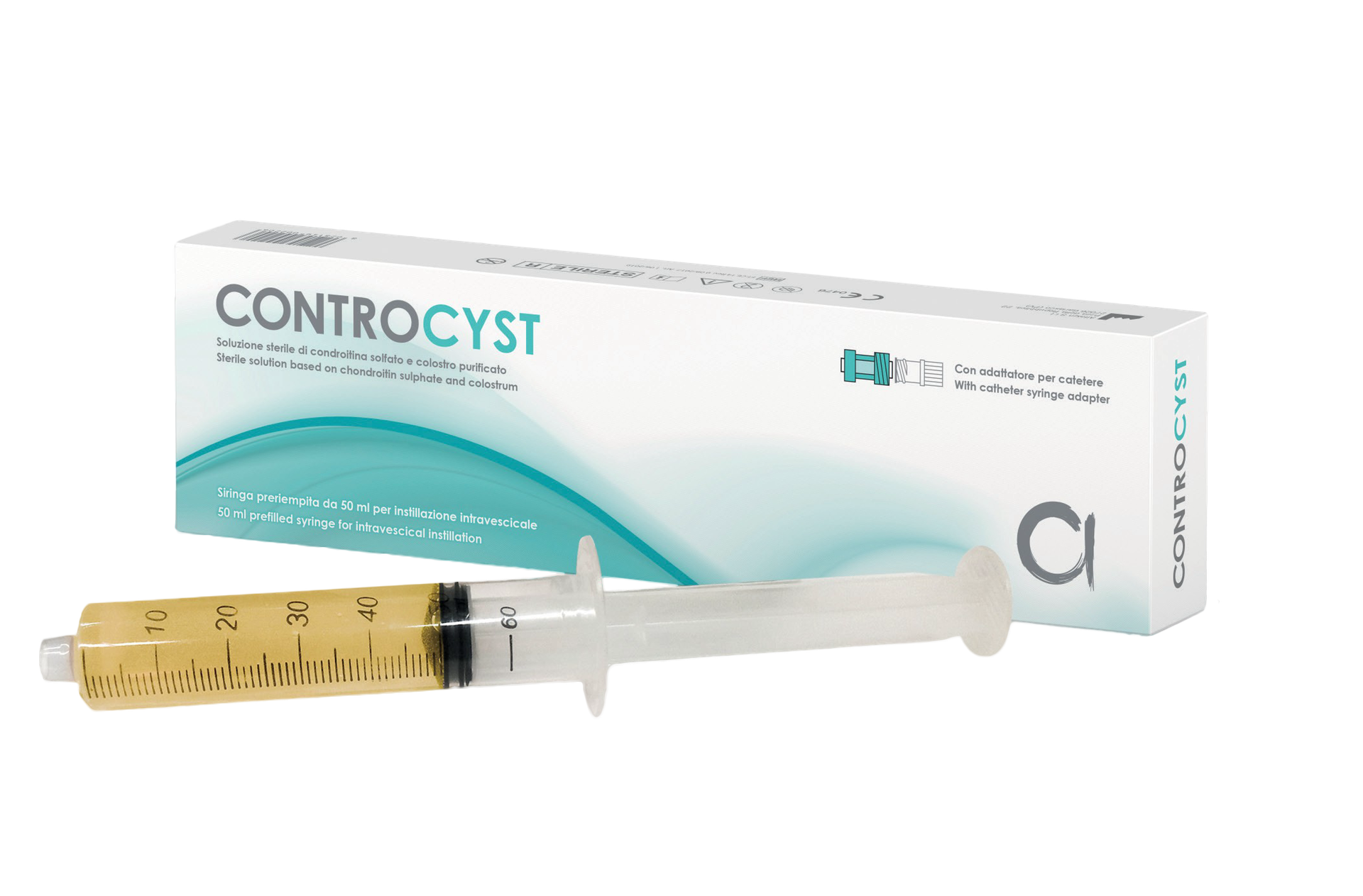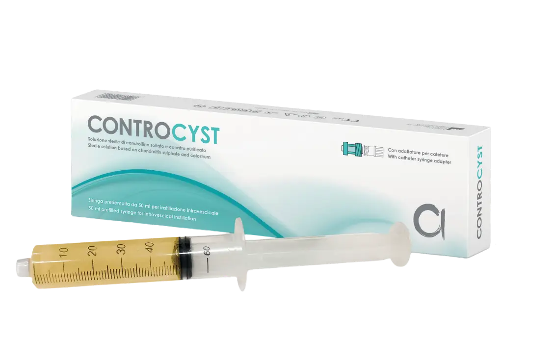 Controcyst® es una solución estéril intravesical en jeringa precargada de 50 ml, a base de Sulfato de condroitina, calostro purificado y polímero tixotrópico. Esta combinación actúa restaurando la capa GAG de la vejiga y generando una capa protectora impermeable, lo que ayuda a recuperar la función barrera natural del urotelio.